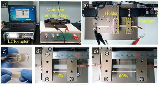 Figure 5 shows the test equipment we used to evaluate the performance of the proposed flexible strain sensors. The tensile test machine was composed of a linear motor (LX2001CP, Misumi, Japan) and a linear axis encoder (SRSH24YN-200, Misumi, Japan). The initial value, tensile distance, and tensile speed can be adjusted using the Lab View application. Electric signals were acquired using an LCR meter (LCR 4110, Wayne Kerr Electronics, London, UK) and two wires. In this study, we mainly measured the resistance changes. The fabricated sensors were measured in real time by connecting the LCR meter with a computer (Figure 5).