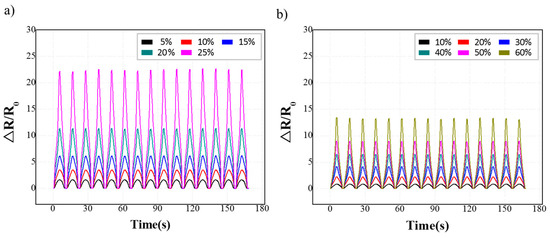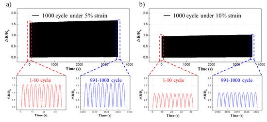 Figure 7 shows how resistance changes occur evenly by repeatedly applying strain to the fabricated sensors. Figure 7a shows the measurements of resistance changes according to the strain in the longitudinally aligned strain sensor. We performed 15 repeated experiments over time. To effectively compare the resistance change rate in each strain range, the time it takes for one repetition was set to 10 s. For the longitudinally aligned strain sensor, an increase in the maximum strain range from 5% to 25% increased the sensitivity from 1.62 to 22.50. For the laterally aligned strain sensor, when the maximum strain range increased from 10% to 60%, the sensitivity increased from 0.85 to 13.09. This result was consistent with the prediction that the longitudinally aligned strain sensor has a relatively narrow strain range and high sensitivity, while the laterally aligned strain sensor has low sensitivity and a relatively broad strain range. Furthermore, the values measured in each cycle were also stable.