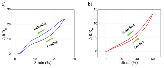 Loading/unloading behaviors. (a) Measurement of resistance change rate according to the elongation of the longitudinally aligned flexible strain sensor. (b) Measurement of resistance change rate according to the elongation of the laterally aligned flexible strain sensor.
