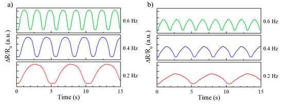 Figure 9 shows a graph for the hysteresis of the fabricated sensors. Figure 9a illustrates the hysteresis curve for the longitudinal strain sensor. As shown in the figure, the relative change in the resistance does not overlap with that in the loading–unloading cycle for the longitudinal strain sensor. On the other hand, Figure 9b shows that the hysteresis performance of the lateral strain sensor was more stable than the longitudinal strain sensor. The flexible strain sensors are attached to detect motions on the body parts that cause repeated rapid changes, such as arms, knees, and wrists. Therefore, whether the values are measured evenly with no significant changes under different frequency conditions in flexible strain sensors is an important factor [23]. Figure 10 shows the result of evaluating flexible strain sensors fabricated in different frequency conditions. In the case of the longitudinally aligned strain sensors, the measured value of was 1.5475 at 0.2 Hz, 1.5600 at 0.4 Hz, and 1.5774 at 0.6 Hz. When the increase in resistance was verified using these sensors, the resistance increased by approximately 1.93% at 0.6 Hz. In the case of the laterally aligned strain sensor, the measured value of was 0.8245 at 0.2 Hz, 0.8514 at 0.4 Hz, and 0.8592 at 0.6 Hz. Thus, the resistance increased by approximately 4.21% at 0.6 Hz. Even though the waveforms were uniform, the resistance change rates for both types of sensors increased as the frequency increased.