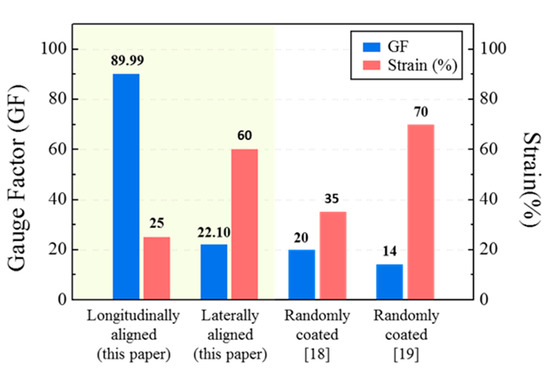 Figure 11 shows a graph comparing the strain sensor with randomly arranged silver nanowires that were researched previously and the two types of strain sensors fabricated in this study. In the longitudinally aligned strain sensor, the maximum GF measurement was 89.99 in the 25% strain range. This value is more than five times higher than the flexible strain sensor researched using the same material in the same strain range and under the same strain condition (ε = 25%) [19]. This result shows that the longitudinally aligned strain sensor proposed in this study can measure the small motions that are difficult to be detected by existing strain sensors fabricated by randomly arranging the silver nanowires. Furthermore, the maximum GF of the laterally aligned strain sensor was measured at 22.10 in the range of up to 60%. This had a lower strain range but a higher sensitivity compared to those presented in previous studies [18]. The nanonetwork of laterally aligned strain sensors was stable, and the sensitivity was lower than that of the longitudinally aligned strain sensor, but it was higher than that of existing strain sensors. This can be attributed to the large number of silver nanowires used in coating existing strain sensors by the drop casting process; this process on the other hand, coated the silver nanowires thinly (1.5 μm) and uniformly using the dip coating process.