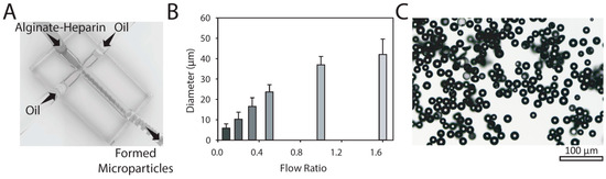 A hydrophobic coated glass microfluidic droplet junction chip (100 µm; Dolomite Microfluidics, Charlestown, MA, USA) was utilized to make monodispersed alginate-based microparticles. An alginate-heparin solution (1.2% w/v) was used as the inner aqueous phase. Mineral oil containing 10 wt % Span 80 was used as the continuous phase to help the formation of droplets. Flow rates of 2, 3, 5, 7, and 8 μL min−1 for the alginate flow and 25, 15, 12, 10, 7, and 5 μL min−1 for oil flow were applied using two syringe pumps (Harvard Apparatus PHD 2000). Bright field images were taken at various time points using a Leica DMIL inverted microscope. The formed microparticles were collected in a 200 mM calcium ion bath and left for 20 min for ionic crosslinking prior to being extensively washed with a 10 mM NaCl solution and centrifuged (21,000 rpm for 7 min) twice before further use.