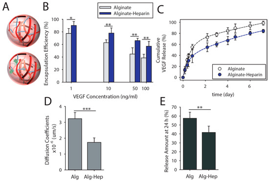 The presence of heparin increased vascular endothelial growth factor (VEGF) binding and prolongs its release. (A) Schematic of microparticles (16 µm in diameter) were used to encapsulate therapeutic proteins (here VEGF). (B) VEGF binding efficiency of alginate and alginate-heparin microparticles at various initial concentrations of VEGF after 16 h incubation at 4 °C. (C) VEGF release kinetic of microfluidic-synthesized microparticles prepared from alginate and alginate-heparin in phosphate buffered saline (PBS) at 37 °C. (D) Calculated diffusion coefficients of VEGF from microparticles and (E) the cumulative amount of released VEGF after 24 h. The presented data are expressed as an average ± SD; number of independent experiments, n = 3; number of samples per experiment, s = 5). The lines in the graphs are guide for the eye. *, **, and *** indicate significant difference of p < 0.05, p < 0.01, and p < 0.001, respectively, as evaluated by one-way ANOVA.