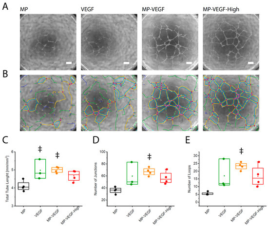 2D capillary network formation. Capillary-like network formation by endothelial cells on growth factor-reduced Matrigel affected by addition of microparticles releasing VEGF-A. (A) Morphology of vascular networks after 24 h and (B) evaluation with the Angiogenesis Analyzer ImageJ plugin; red dots indicate junctions, blue lines indicate loops, scale bar: 300 µm. MP: microparticles, MP-VEGF: microparticles releasing VEGF-A (50 ng/mL initial loading), MP-VEGF-H: microparticles releasing high concentration of VEGF-A (100 ng/mL initial loading). (C) Total vascular tube length. (D) Number of junctions. (E) Number of loops, ‡ indicates significant difference comparing to samples containing microparticles alone (p < 0.05) evaluated by one-way ANOVA.