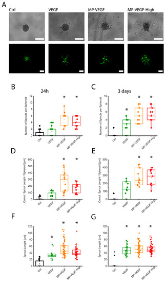 To test the impact of MP-VEGF on angiogenesis in the 3D microenvironment, spheroids of endothelial cells with a size of 500 cells per spheroid were formed and embedded in the growth-factor reduced Matrigel. Figure 4A shows the morphology of endothelial cell sprouts growing from a spheroid after 3 days of culture. A significantly higher number of sprouts were observed in samples stimulated by VEGF-A-loaded microparticles compared to the control and to the samples containing VEGF-A alone in both time points (Figure 4B,C). Cumulative sprout length per spheroid, that is, the total length of all sprouts growing from a spheroid, was also significantly higher in samples containing MP-VEGF (Figure 4D,E). No significant difference was observed between the two concentrations of VEGF tested. All samples containing VEGF showed an increased length of individual sprouts compared to the unstimulated control (Figure 4F,G), but overall MP-VEGF were the most potent stimulators of angiogenesis in the 3D microenvironment. Although VEGF is a potent growth factor to initiate angiogenesis, formation of mature and stable vascular network is dependent on the presence of multiple growth factors [38,39]. In future studies, we will examine the co-delivery of multiple growth factors such as VEGF and platelet-derived growth factor (PDGF) [40] to not only to promote angiogenesis but also to help maturation of formed blood vessels.