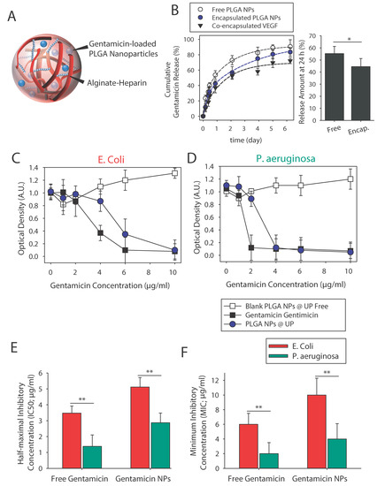 Evaluation of gentamicin release. (A) Gentamicin-loaded poly(lactic-co-glycolic) acid (PLGA) nanoparticles (NPs) encapsulated in alginate-heparin microparticles. Estimated amount of released gentamicin after 24 h. (B) Cumulative release profiles of gentamicin from free PLGA NPs and from microparticle-encapsulated PLGA NPs. Cumulative release profiles of co-encapsulated VEGF from alginate-heparin microparticles are also shown here. Analysis of the ability of gentamicin PLGA NPs to inhibit the growth of (C) Escherichia coli and (D) Pseudomonas aeruginosa as determined by measurement of absorbance at 600 nm. Estimated (E) half-maximal inhibitory (IC50) and (F) minimum inhibitory concentrations (MIC) values for free and PLGA-encapsulated PLGA NPs (average ± SD, n = 3). * and ** indicate significant difference of p < 0.05 and p < 0.01, respectively, as evaluated by one-way ANOVA. The lines in the graphs are a guide for the eye.