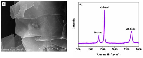 Figure 1 illustrates the characterization of FLG. Figure 1a is the SEM image of FLG, showing that FLG retains its original laminated structure, which is transparent with folding at the edges, suggesting very few layers. Figure 1b portrays the Raman spectrum of FLG. Three typical features of FLG, the D-band (1342 cm−1), G-band (1575 cm−1), and 2D-band (2701 cm−1), are observed. As shown in Figure 1b, the peak shape of the 2D-peak is widest, the intensity of the G-peak is very strong, and the intensity ratio of the G to 2D band (IG/I2D) is more than 1, demonstrating that the graphene samples exhibit a few-layered structure [,], as is proved in SEM (Figure 1a). However, the presence of the D-band (1342 cm−1) illustrates the occurrence of disorder and defects in the graphene samples [,].