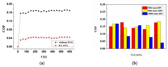Friction coefficient (COF) results for Si3N4/Si3N4 sliding pairs under three working conditions. (a) COF with a 40 N load and 3000 r·min−1 rotating speed with and without 0.1 wt% FLG; (b) comparison of COF results under three different working conditions.