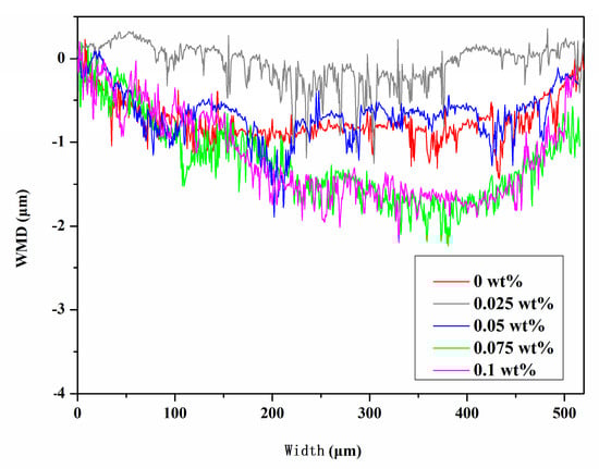 The wear mark depth (WMD) profile curves of the Si3N4 disk lubricated by different FLG concentrations under a load of 40 N, at a rotational speed of 3000 r·min−1 are shown in Figure 3. It can be seen that the FLG concentration has a certain influence on the WMD of the Si3N4 disk. The WMD can be reduced when the Si3N4 disk is lubricated by a small amount of FLG. However, when the FLG concentration is too much, it will lead to aggregation and to the increased wear.