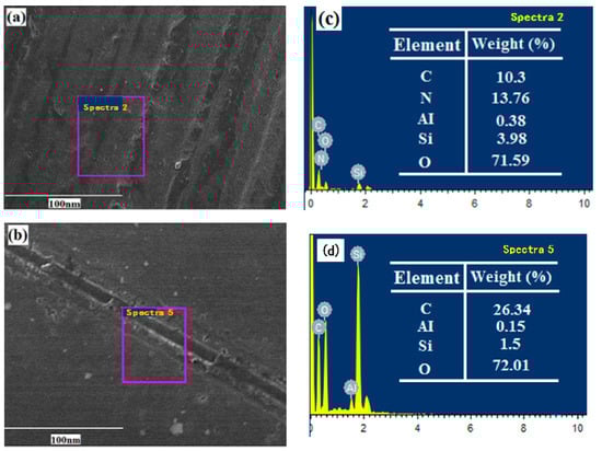 SEM image of worn surfaces lubricated by (a) pure Mdol and (b), Mdol containing 0.1 wt% FLG; (c,d) Energy-dispersive X-ray spectroscope (EDS) maps of the areas pointed out in (a,b).
