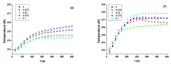 Friction causes heat and temperature fluctuations during friction and wear testing. Temperature change with time for the Si3N4/Si3N4 sliding pairs lubricated by Mdol with various contents of FLG under different conditions are shown in Figure 5.