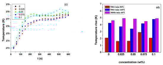 By testing different contents of FLG to the base oil, we observe that a low content of FLG is better in deterring temperature rise at low-speed (500 r·min−1 rotating speed). First of all, this can be attributed to the excellent physical properties of FLG (high thermal conductivity and large specific surface area) []. When a small amount of FLG is added to Mdol, the overall thermal conductivity of the mixed liquid is increased []. During the sliding process, the COF was small, and the lubricant oil flow will take away some of the heat, furthermore, FLG particles distributed in the Mdol will promote heat transfer []. Therefore, the heat transfer performance is improved, resulting in a smaller temperature rise. When FLG content increases, a lot of graphene will agglomerate, leading to slower lubricant flow and reduced heat transfer. Secondly, for low rotational speeds, at the same content of FLG, the temperature rise at high loads is higher. This is because the friction coefficient is higher at heavy loads, resulting in more heat generation and therefore a rise in temperature rise. Interestingly, lubricating oils with different graphene concentrations have less influence on the temperature rise at high speed and low load, which is because the centrifugal force has a large influence at high rotation speed, causing some graphene to be scooped out of the wear track. In addition, the friction generates more heat at high speed, which cannot be offset by the cooling effect of a small amount of graphene.