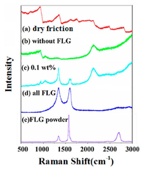 Since Raman spectroscopy is a superior, sensitive, and widely used non-destructive characterization technique and is also an effective tool for assessing the quality of carbon materials. In this work, we use this technique to analyze the rubbing surfaces. Figure 6 shows the Raman spectra of the wear surfaces of the Si3N4 disks lubricated by Mdol containing different contents of FLG, as well as that of original FLG powder and in the case of dry friction. In contrast to dry friction (Figure 6a), it can be inferred that the band at 2194 cm−1 is the typical signal of Mdol (Figure 6b). When Si3N4 disks are lubricated by Mdol containing 0.1 wt% FLG (Figure 6c), Raman spectra of the wear surfaces not only show the lubricating oil signal, but also the FLG signal at the bands 1343 and 1595 cm−1. This indicates that FLG is adhered to the wear surfaces and forms a lubricating protective film. Compared to the Raman signal of FLG powder (Figure 6e), for all FLG (Figure 6d) and Mdol with 0.1% FLG, the intensity ratios of the D and G bands (ID/IG) are increased, which illustrates that the adhered graphene has become severely disordered [], and as a result, the peak shape of 2D becomes weak and wide []. Raman spectroscopy was carried out to further confirm that the improved tribological behavior of Si3N4/Si3N4 sliding pairs is indeed attributable to the presence of FLG on the rubbing surface. These results validate our assumption that FLG is indeed present and has formed a lubricating protective film on the wear surface.