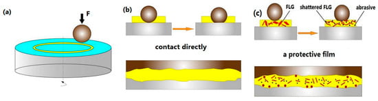Based on the above analysis, a schematic illustration of the tribological mechanism using FLG as a lubricant additive is shown in Figure 7. A schematic diagram of the friction experiment is shown in Figure 7a. As shown in Figure 7b, direct contact between the Si3N4 ceramic ball and disk results in high Hertz contact stress. Therefore, the oil film is quickly broken, and then, the contact surface of Si3N4/Si3N4 sliding pairs is seriously destroyed. When FLG is added to the base oil, it easily enters the rubbing interface and is sheared owing to its two-dimensional structure [], as shown in Figure 7c. The addition of FLG into Mdol prevents direct contact between the Si3N4/Si3N4 sliding pairs because of the formation of a lubricating protective film. In addition, since FLG is easily torn under high Hertz contact pressure, disordered FLG with a much smaller particle size is formed []. FLG then wraps the abrasions to prevent direct contact between the sliding pairs. The reduction of the COF and anti-wear properties may be related to these mechanisms. A lubricating protective film was also confirmed in this paper, as measured by EDS analysis and Raman spectroscopy. The lubricating protective film effectively avoids direct contact between sliding pairs, thereby reducing the wear of the surface and decreasing the average friction coefficient.