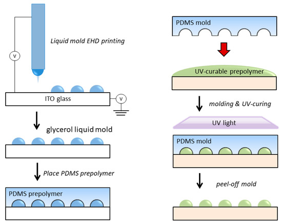 Before the experiment, the ITO glass substrate was ultrasonically cleaned in acetone for 20 min and then dried with air flow. Glycerol solution was first sprayed onto the ITO glass by an EHD printing process. The microdroplets form liquid mold on the surface of ITO glass. The spacing, diameter, and volume of the microdroplets liquid mold can be controlled by processing parameters. The PDMS mold for the microlens fabrication was obtained by casting PDMS mixture (the weight ratio of silicone elastomer to curing agent is 10 to 1) into the ITO glass that contained the EHD printed glycerol micro droplets liquid mold. The cast PDMS was then placed in a vacuum oven at 70 °C for 3 h to fully crosslink it to obtain a PDMS microlens mold. Then take it out, rinse off the surface glycerin, and then dry in an oven for 1 h. The UV crosslinked resin was cast on the surface of any substrate, and then covered with a PDMS mold for solution casting, and irradiated with a 36 W UV lamp (Jmofo, Guangzhou, China) for 3 min. Finally, the PDMS mold was peeled off to obtain a microlens array formed by curing the UV resin (as shown in Figure 2).