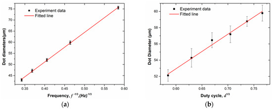 As the pulse frequency increases, the time during which each injection cycle voltage acts on the Taylor cone becomes shorter, the accumulated charge and the volume of the solution decrease, and thus the diameter of the droplet decreases. Therefore the frequency of the pulse voltage will significantly affect the dot pattern diameter, as shown in Figure 4a. The scaling law can be written as