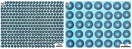 Inkjet printing and laser-induced transfer provide methods of fabricating microlens molds or directly fabricating microlens arrays [9,10]. The surface tension causes the resulting liquid droplets to be almost perfectly spherical, so that high optical quality microlens can be printed or replicated. However, the scale is still limited, which cannot meet the needs of some special applications. Moreover, inkjet printing is limited by the viscosity of the ink, making it difficult to print high viscosity materials [11].