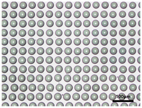 Finally, we combined the PDMS soft lithography process to prepare microlenses based on liquid molds. The PDMS mixture (the weight ratio of silicone elastomer to curing agent is 10 to 1) was slowly poured onto the liquid microlens mold (as shown in Figure 6). Since glycerin has a certain viscosity and can adhere well to the surface of the ITO glass, it can still maintain a good morphology when the PDMS is slowly poured. However, this process must be carefully done, paying attention to the rate of pouring, which would otherwise cause the liquid mold to be washed away. The cast PDMS was then heat cured in a vacuum oven at 70 °C for 3 h to obtain a PDMS microlens mold. Then it is taken out and the surface glycerin is rinsed off and then dried in an oven for 1 h. The UV crosslinked resin was cast on the surface of PET substrate, and then covered with a PDMS mold for solution casting, and irradiated with a 36 W UV lamp for 3 min. Finally, a microlens array of UV curable resin was obtained using solution casting PDMS mold, as shown in Figure 7.