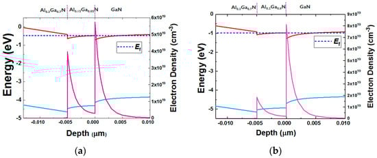Simulated band diagrams with an Al0.3Ga0.7N/Al0.15Ga0.85N barrier (a) and an Al0.3Ga0.7N/Al0.2Ga0.8N barrier (b).