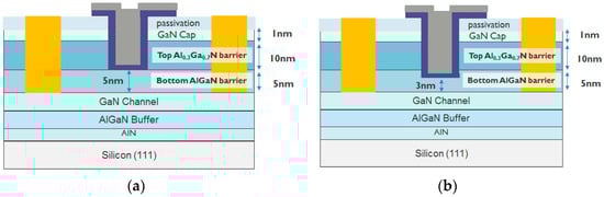 Schematic of device structures of recessed gate AlGaN/GaN MIS-HEMTs with a 5 nm remaining bottom AlGaN barrier under the gate region (a) and a 3 nm remaining bottom AlGaN barrier under the gate region (b).