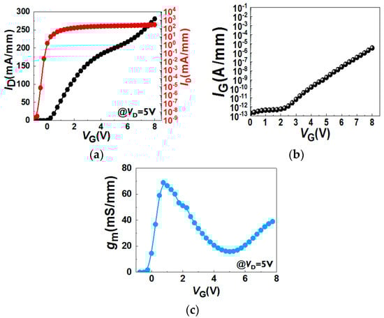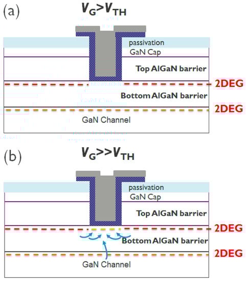 In the case of devices with a 5 nm remaining bottom AlGaN barrier under the gate area, a gate recess process is performed to etch until it reaches the surface of the bottom AlGaN barrier (Figure 4a). The ID–VG, IG-VG, and gm–VG characteristics are shown in Figure 5. Note that all ID–VG characteristics in this work are measured from a lower VG till a higher VG. A double hump of gm–VG characteristic is observed in Figure 5c, which is similar to the literature [15,16,17,18]. The double hump of gm–VG characteristics in these references [15,16,17,18] arises from a shrinking of the depletion region below the gate, due to the depletion-mode characteristics. In our case, the recessed gate AlGaN/GaN MIS-HEMTs has a double barrier design. A double channel model that considers the electron transfer from the bottom channel to the top channel is proposed to explain the double hump gm-VG characteristics. First of all, once the VG is larger than VTH, the bottom channel is gradually turned on (Figure 6a and Figure 7a), resulting in a first gm peak as shown in Figure 5c. It is worth noting that at this stage the top channel from source to drain is initially disconnected below the gate dielectric due to a recessed gate process. However, when the VG is above 5 V, the top channel could be connected again, as shown in Figure 6b. In this scenario, the electrons can be transferred from the lateral 2DEG channel in the access region and/or interface below the bottom AlGaN barrier to the interface between the dielectric and the bottom AlGaN barrier [20,21] (Figure 7b). Then, the electrons can be accumulated under the gate dielectric [20,22]. This leads to the formation of the second channel under the gate, further connecting the source and drain to form the top channel leading to a second gm peak (Figure 5c).
