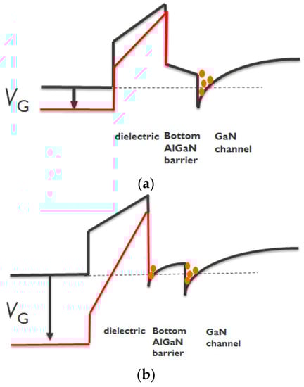 - Kamath, A.; Patil, T.; Adari, R.; Bhattacharya, I.; Ganguly, S.; Aldhaheri, R.W.; Hussain, M.A.; Saha, D. Double-Channel AlGaN/GaN High Electron Mobility Transistor with Back Barriers. IEEE Electron Device Lett. 2012, 33. [Google Scholar] [CrossRef]