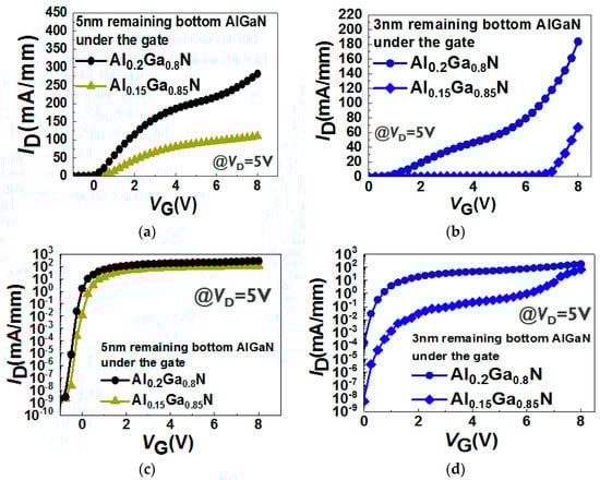 ID-VG in a linear scale (a,b) and a logarithmic scale (c,d) in the devices with 5 nm or 3 nm remaining bottom AlGaN layer under the gate region with different Al% in the bottom AlGaN barrier.
