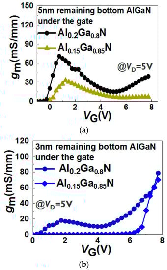 gm–VG characteristics in the devices with a (a) 5 nm or (b) 3 nm remaining bottom AlGaN layer under the gate region with different Al% in the bottom AlGaN barrier.