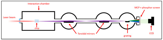 HHG experiments were performed under vacuum conditions in a beamline composed of an interaction chamber (working pressure 10−5 mbar) and a grazing incidence XUV spectrometer (working pressure 10−6–10−7 mbar) (see Figure 2). The beam of a Ti:Sapphire laser (25 fs, 1 kHz, 10 mJ) was coupled into the microchannel, which was located inside the interaction chamber. The driving laser beam was focused at the entrance of the hollow waveguide by a 20-cm focal lens. The spatial coupling of the beam with the microchannel was achieved with the help of a high-precision motorized alignment stage. The gas pressure was accurately controlled by a system composed of a needle valve and a pressure gauge placed in the gas line after the needle valve. The high-order harmonics radiation was acquired by a spectrometer composed of grazing-incidence optics. A first toroidal mirror was used for generating an intermediate focus for spectroscopy purposes. The second toroidal mirror focused the HHG beam on a dispersion grating. The dispersed HHG signal was acquired by means of a vacuum compatible detector (Photek, VID140, East Sussex, UK) incorporating one micro-channel plate (MCP) and a P20 phosphor screen. The image displayed on the phosphor screen was acquired by a CCD camera (Apogee Ascent A2150, Andor, Belfast, UK). The same chip was used for HHG for several weeks, with no evident degradation.