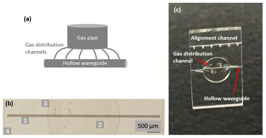 The basic design of the glass chip for HHG is shown in Figure 3a; it consisted of a cylindrical top central reservoir (gas pipe) from which several small microchannels (gas distribution channels) departed and reached the cylindrical horizontal main channel (hollow waveguide). The gas was inserted through the top reservoir and, thanks to the homogeneously distributed small microchannels, it uniformly filled the hollow waveguide. In fact, the driving laser that propagated inside the waveguide encountered a uniform gas density.