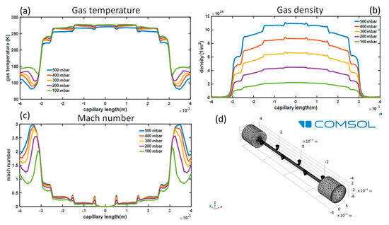 To investigate the gas distribution in the microchip, we modeled the gas flow through the device in the final steady-state using Comsol Multiphysics. The mesh cell dimensions varied between a maximum value of 140 μm and a minimum value of 15 μm. The results, depending on the gas backing pressure, are shown in Figure 4. In particular, the gas temperature, density, and Mach number along the capillary axis are reported. With the exception of small peaks next to the outlets of the distribution channels, the gas flow exhibited the typical features of gas flows within micro-channels with a high length to diameter ratio. The gas flow was nearly isothermal and subsonic in most of the flow region. The density profile smoothly decreased from the center towards the waveguide outlets at the lowest backing pressure value, but it showed stronger spatial modulation at higher pressures. Abrupt changes in the behavior of all flow properties were observed in correspondence to the exits towards the vacuum chamber, where the gas underwent strong expansion.