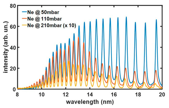 HHG spectra generated inside the chip using Ne gas with a backing pressure of 50 (blue), 110 (red), and 210 mbar (yellow); this latter curve is magnified 10 times.