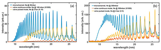 Comparison between HHG spectra produced inside the microchannel (blue), in a continuous gas jet (red), and in a pulsed gas jet (yellow) for Ne (a) and He (b) gases.