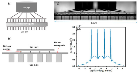 It is possible to achieve an even higher modulation of the gas density inside the hollow waveguide by injecting the gas through a series of de Laval micro-nozzles whose supersonic flow condition, at the end of the divergent section, helps produce a more focused gas jet. The scheme of the chip is shown in Figure 7c. In this device, there is no gas reservoir, and the convergent section of each nozzle is almost directly facing the gas inlet. Different nozzle geometries were numerically investigated, using Comsol software, in order to enhance/control the density modulation along the axis of the hollow waveguide.