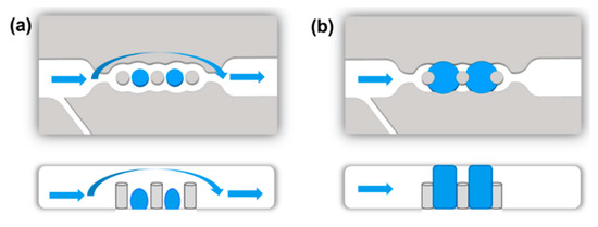 Stimulated by this, we aim to integrate microvalves as fluid control elements into compartmentalized microfluidic devices with immobilized biocatalysts and showcase the long-time functionality in a multi-step reaction. For this purpose, we utilize the previously established concept of hydrogel microvalves which controllably block or open the microfluidic channel. We chose to apply microfluidic devices formed by assembling photostructured polydimethylsiloxane (PDMS) sheets on a glass support (PDMS-on-glass devices). Such devices are valuable tools in research as they can be rapidly prototyped and due to their transparency the fluid flow can be easily visually observed. Additionally, the immobilization of biocatalysts in such devices by several methods such as binding to the glass surface [11] or to other support materials [10] as well as entrapment into a photopatterned matrix [14,21] was previously achieved. In addition, the integration of microvalves in PDMS-on-glass microfluidic devices and switching by a great variety of stimuli was focus of extensive research and multiple concepts were realized [22,23,24]. Valves in single layer microfluidic devices can be realized by intrinsically active materials such as hydrogels. Hydrogels are crosslinked polymer networks that swell in water and change their swelling degree in response to certain stimuli [25]. Thus, controlled change of the swelling degree of a hydrogel placed in a microfluidic channel allows determining whether the fluid can or cannot pass the hydrogel, i.e., whether the valve is opened or closed. To define the position of the hydrogel and prevent movement under a fluid flow it is hold in place by valve seats (Figure 1).