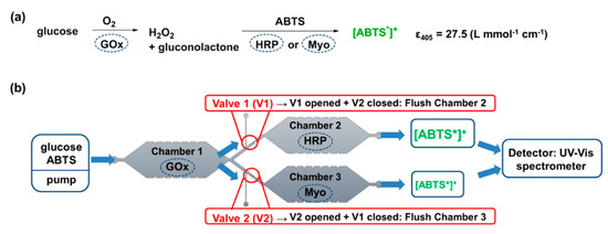 (a) Chemical reaction for the two-step enzyme-catalyzed conversion of glucose and ABTS to the UV-Vis active [ABTS*]+. (b) Integration of the enzyme-catalyzed reactions in a microfluidic device with three separated reaction compartments and immobilized enzymes. Switching between the bi-enzymatic reactions GOx-HRP and GOx-Myo is done by hydrogel valves and the concentration of the formed [ABTS*]+ is measured by UV-Vis spectroscopy.
