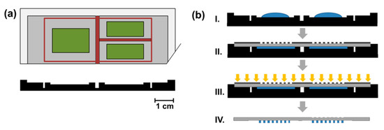The heat pads for the electro-thermal switching of hydrogel microvalves were produced from polyimide foils (thickness: 50 µm) coated with copper (25 µm) on both sides. Conducting paths were etched into one side using a standard printed circuit board (PCB) process. In short, the copper surface was coated with a photoresist which was subsequently UV-structured and developed. Then, the uncovered copper was etched and the resist was removed. Subsequently, two resistors (30 Ω, one-component carbon conductive varnish SD 2843 HAL, PETERS Speziallacke für die Elektronik, Kempen, Germany) were placed on the contact zones by screen print (Figure S3). The resistors are used as heating elements to control the polymer actuators in the valve seat. The size and relative position of the two resistors are adjusted to the position of the valve structures in the microfluidic design. Heating of the resistors was done by applying a voltage of 4 V with a power supply (QUAT Power, LN 3003, Pollin Electronic, Pförring, Germany). A switch was integrated to control the current supply and consequently the heating of each resistor. To determine the voltage required for the heat-induced shrinking of the microvalves, the relation between voltage and resulting temperature was measured. For this purpose, the heat pad was placed in the aluminum holder (see Section 2.6) and a glass slide (same type as used for the microfluidic chips) was placed on top. Subsequently, the voltage was turned on and the temperature of the glass surface above the resistor was measured with a temperature sensor. At a voltage of 4 V, the temperature of the heating resistor reached 40 °C, which is sufficient to induce shrinking of the hydrogel. However, to account for cooling effects upon a continuous fluid flow in the microfluidic device, a higher voltage (5 V) was applied to reach a higher temperature (48 °C). With this setup, both microvalves could be opened independently by heating of the respective heat resistor as only slight passive warming (up to 28 °C) of the other resistor occurred. The rapid dissipation of the heat is promoted by the high thermal conductivity of the aluminum holder on which the heat pad and the microfluidic chip are placed.