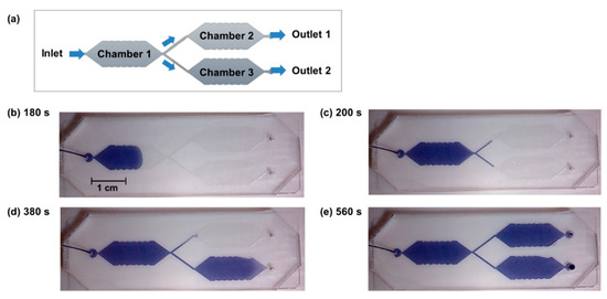 Investigation of the filling of a microfluidic device with three separated reaction chambers and a Y-junction without microvalves. The design is schematically shown in (a). An aqueous solution of blue ink is used for visualization and pumped at a flow rate of 5 µL/min. The pictures (b–e) are taken at different times and visualize that no parallel flushing of the rear chambers occurs.