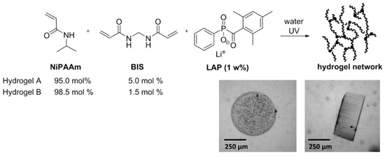 Synthesis of PNiPAAm hydrogels with BIS as a crosslinker. Microscope images show a photopolymerized cylinder of hydrogel A in the swollen state in top (left) and side view (right).