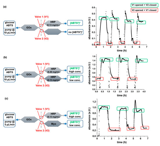Schemes of enzymatic reaction performed in microfluidic devices with an ABTS/glucose substrate solution (5 mmol/L) (left) and results of the corresponding continuous UV-Vis measurements (right). (a) Microfluidic device with only GOx and HRP, (b) Microfluidic device with GOx and two different amounts of HRP, (c) Microfluidic device with GOx, HRP, and Myo. Three (b,c) or four (a) switching cycles of the microvalves were performed. The flow rate of only 5 µL/min in experiment (c) was chosen because of the low activity of Myo. The UV-Vis measurement was performed offline and thus changes of the absorbance occurred with a timely delay of 15 min with respect to the time point of the switching.