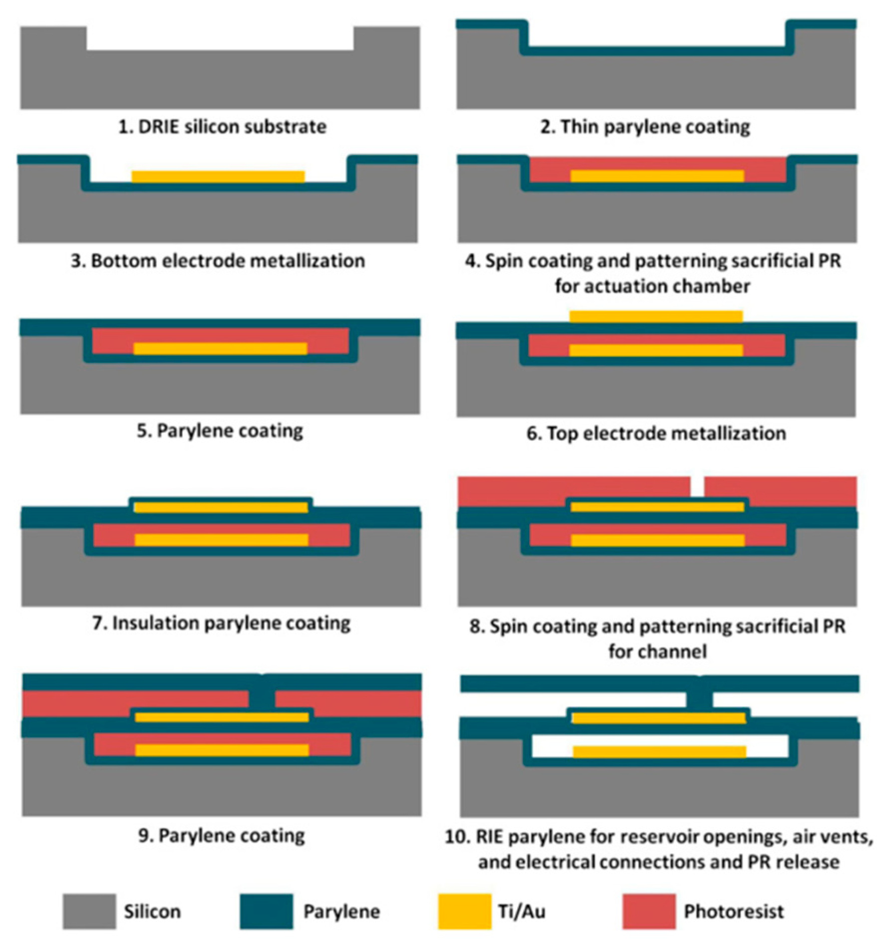 - Oh, J.; Kim, G.; Kralick, F.; Noh, H. Design and Fabrication of a PDMS/Parylene Microvalve for the Treatment of Hydrocephalus. J. Microelectromechanical Syst. 2011, 20, 811–818. [Google Scholar] [CrossRef]