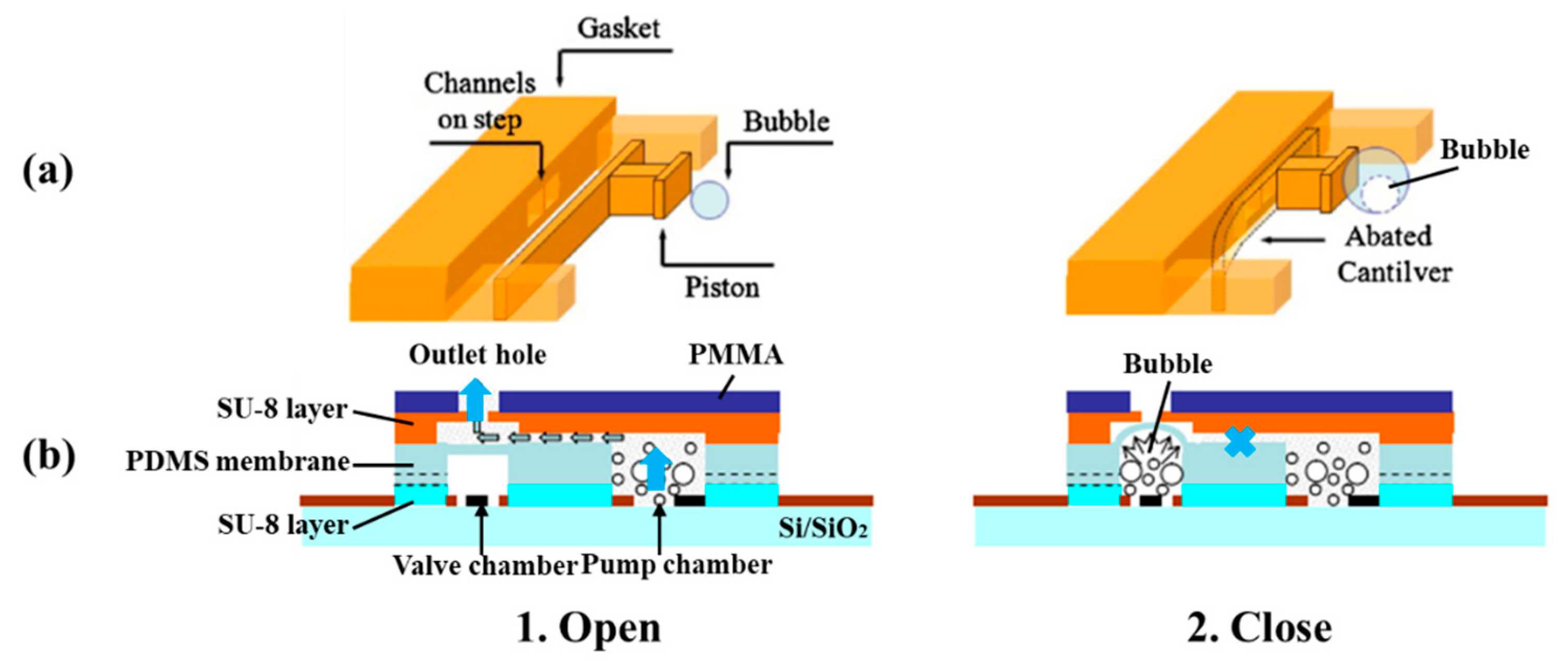 - Im, S.B.; Uddin, M.J.; Jin, G.J.; Shim, J.S. A disposable on-chip micro valve and pump for programmable microfluidics. Lab Chip 2018, 18, 1310–1319. [Google Scholar] [CrossRef]