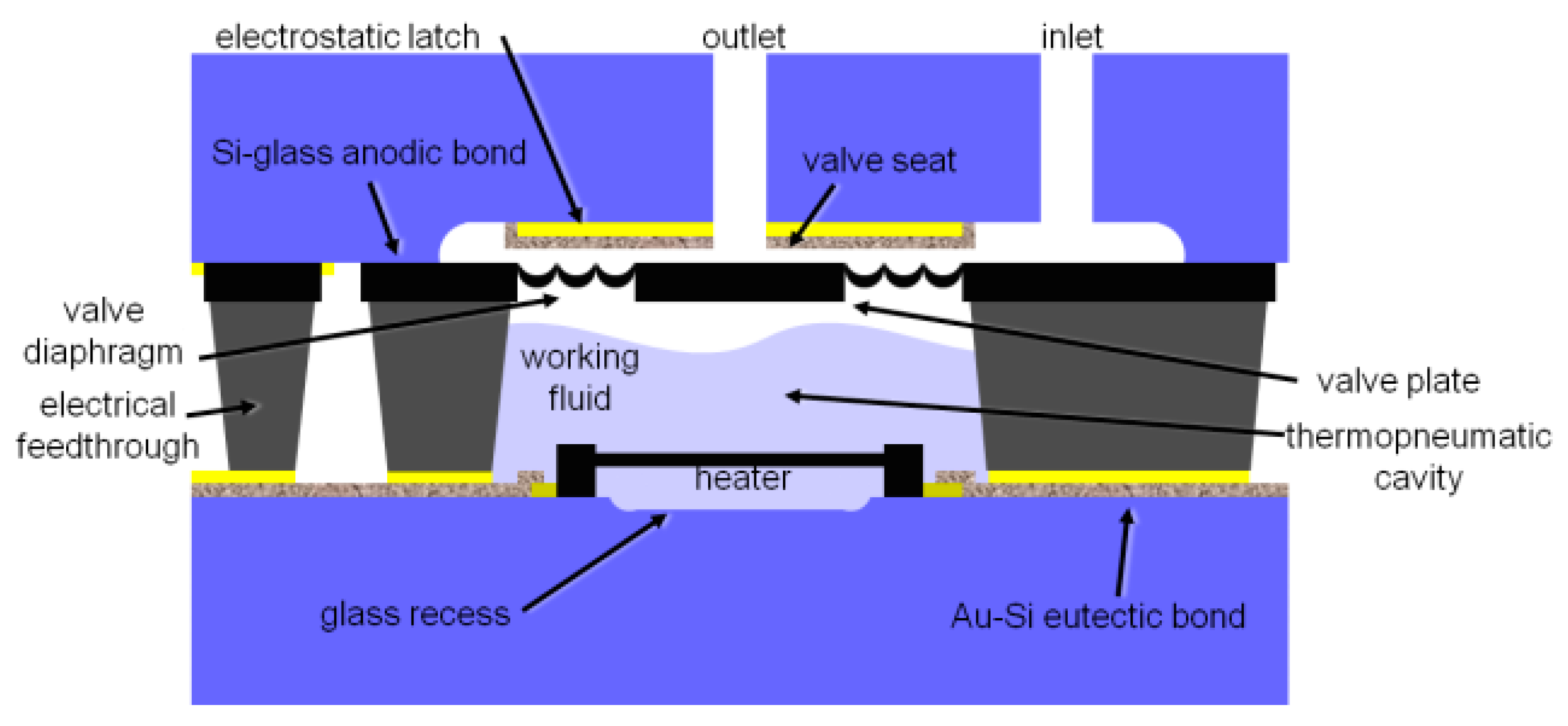 | Potkay et al. [91] | 2012 | TP | Glass, Si-glass, Au-Si | Fluid | Deep boron etch-stop, shallow isotropic etch, NaOH electrochemical etch, ethylene diamine pyrocatechol (EDP) etch | Electrostatic latching | Low energy consumption |