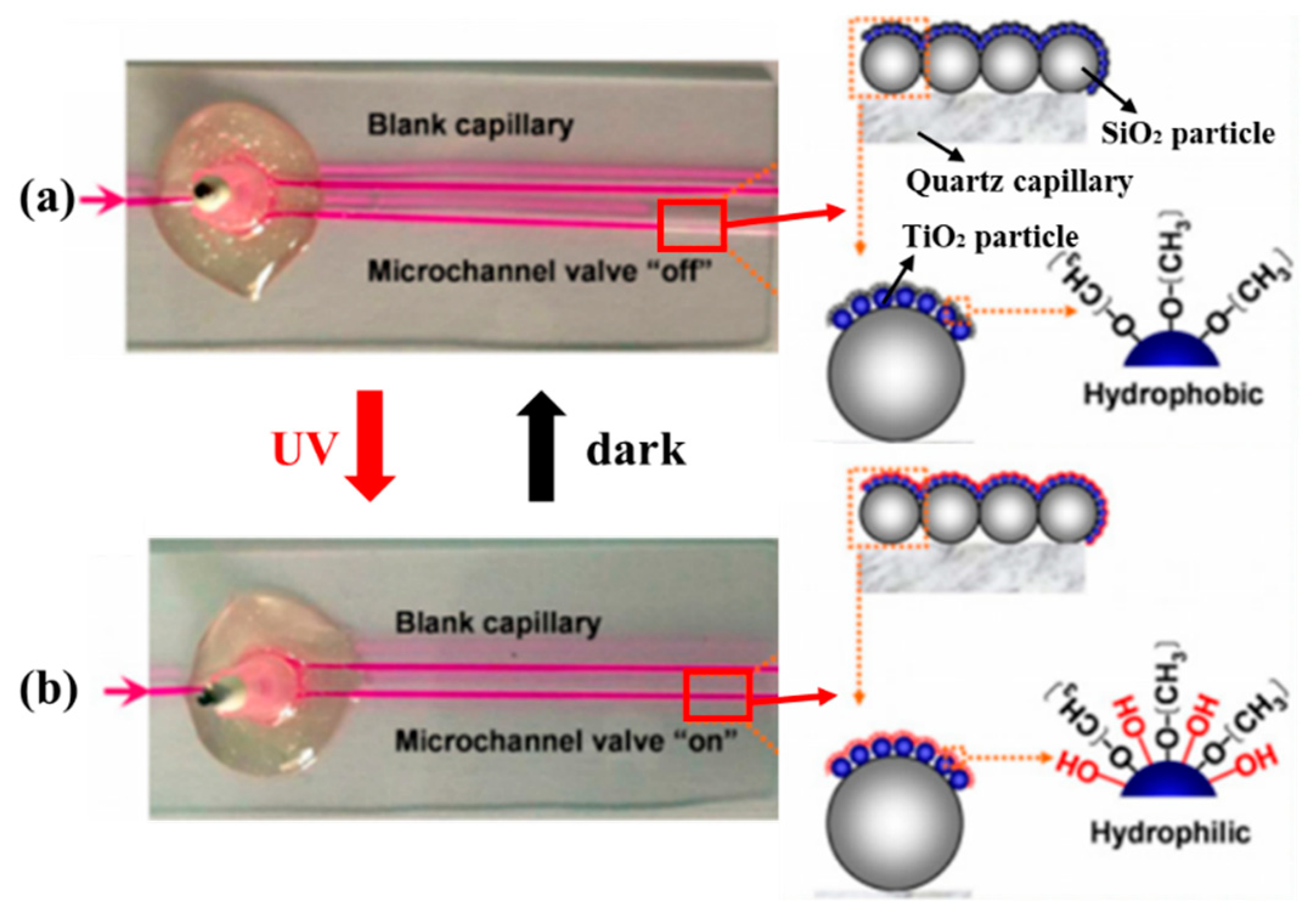 - Guo, T.; Meng, T.; Li, W.; Qin, J.; Tong, Z.; Zhang, Q.; Li, X. UV-driven microvalve based on a micro–nano TiO 2 /SiO 2 composite surface for microscale flow control. Nanotechnology 2014, 25, 125301. [Google Scholar] [CrossRef] [PubMed]