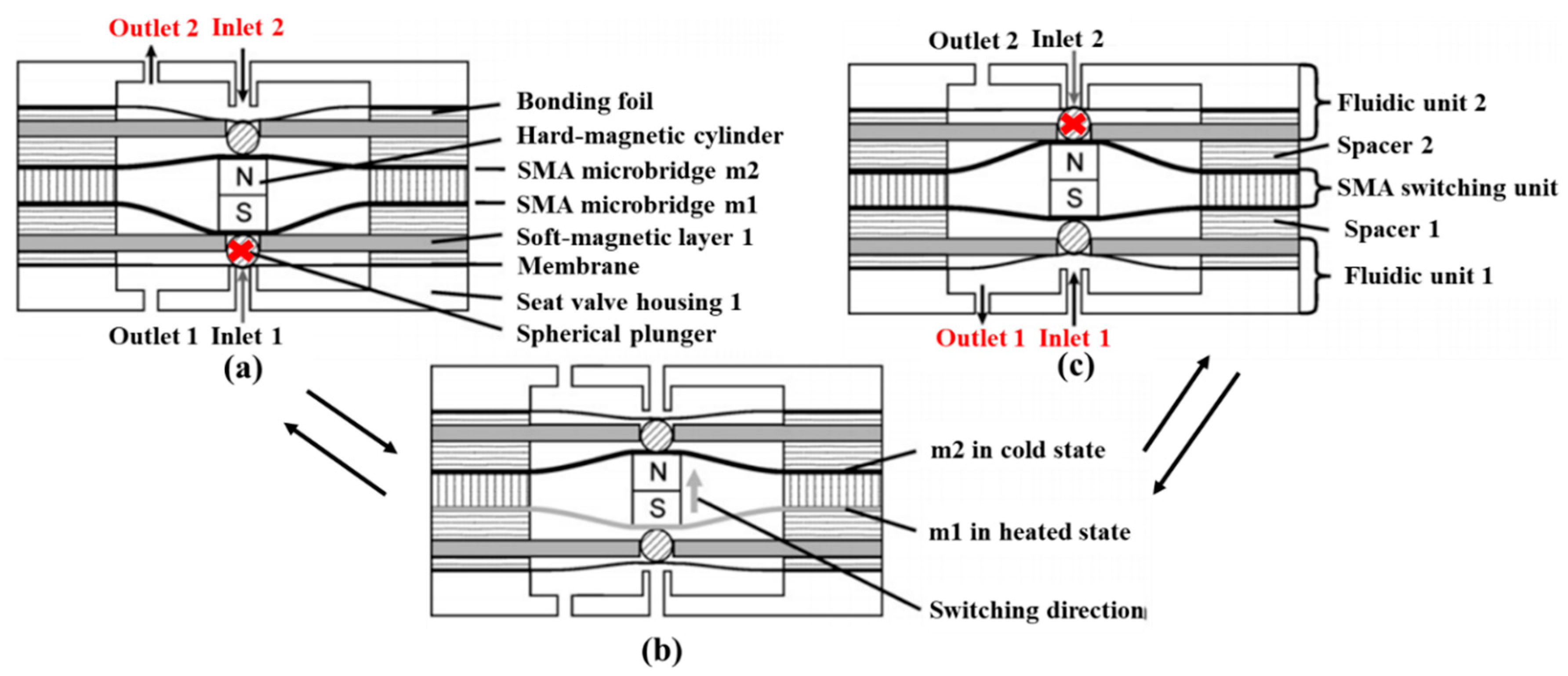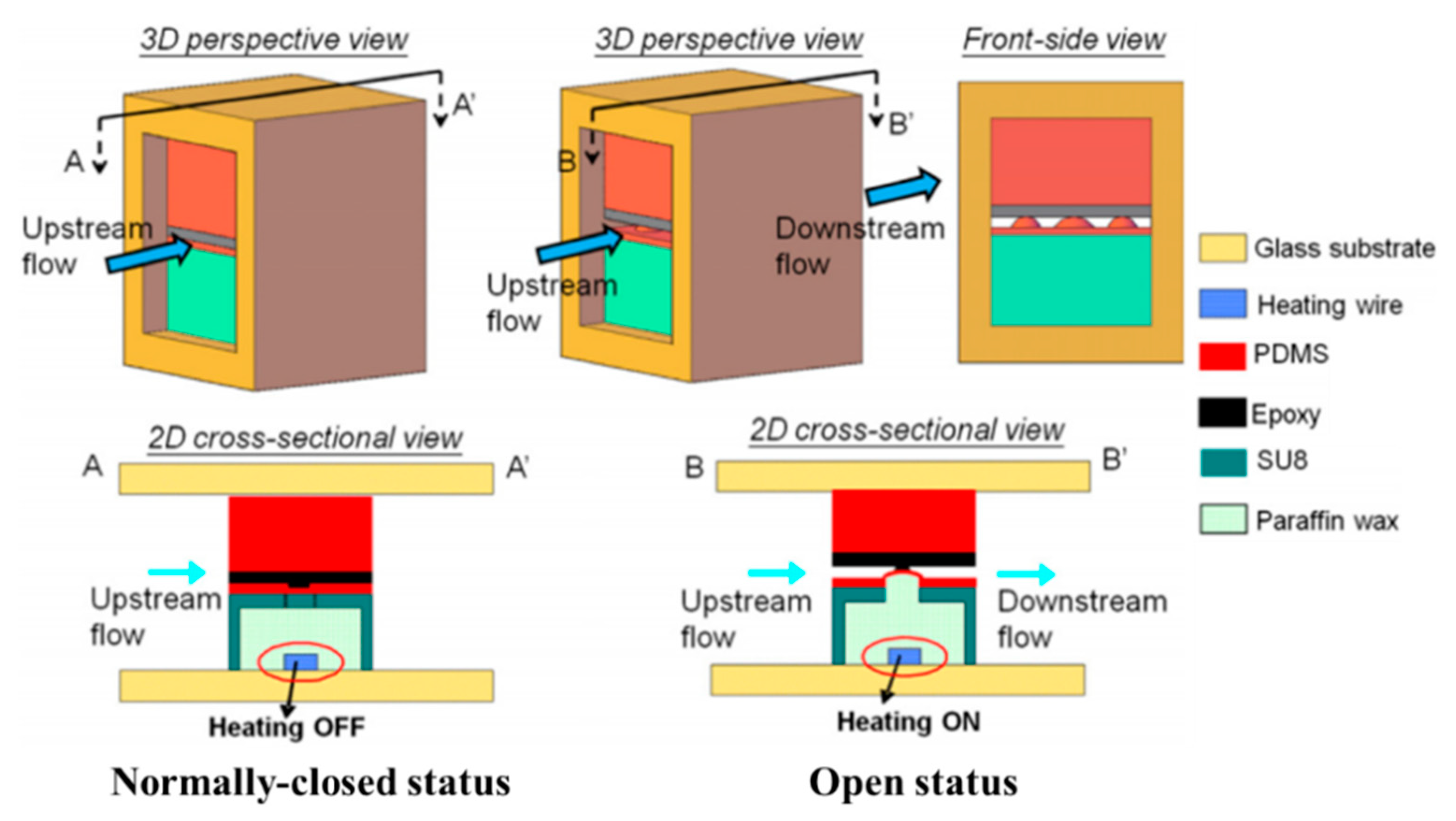 - Cheng, C.; Nair, A.R.; Thakur, R.; Fridman, G. Normally closed plunger-membrane microvalve self-actuated electrically using a shape memory alloy wire. Microfluid. Nanofluidics 2018, 22, 29. [Google Scholar] [CrossRef] [PubMed]