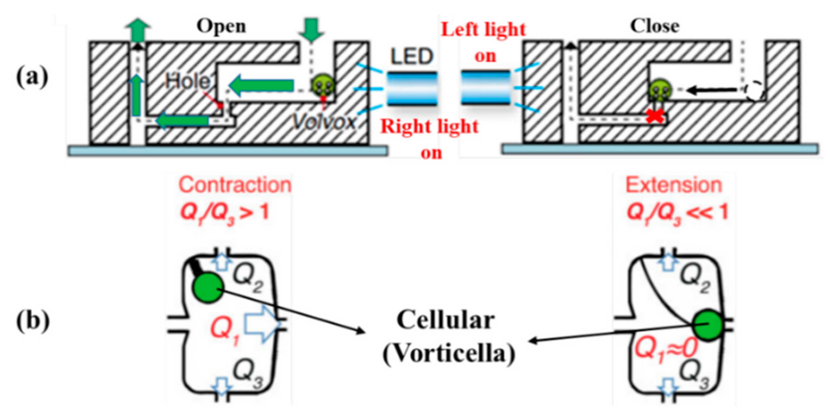 | Nagai et al. [113,114] | NO | Creature | Reversible | V. carteri (light-controlled Volvox) | 50 mmH2O | 30 s | Multilayer microfluidic device |