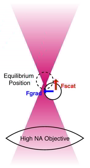 If the ray optics regime can be thought of as treating objects as lenses, then objects meeting the size requirements to be considered as Rayleigh scatterers can be thought of as particles that become polarised in response to the changing electromagnetic field. The interaction of the induced dipoles with the steep gradient of the electromagnetic field associated with the tightly focussed laser results in the object being pulled towards the waist of the beam []. The scattering force can then be understood as being produced because the intensely focussed field is not static, and thus it induces a magnetic field around the dipoles, resulting in the particles being “pushed” [].