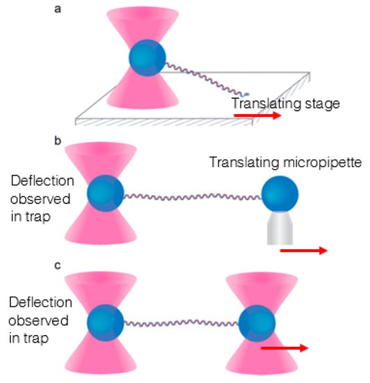 Three different methods for stretching a DNA tether with optical tweezers can be seen in this figure: the translating slide method (a), using an anchoring micropipette (b) and using two separate optical traps (c). Reproduced with permission from Reference []. ©2014 American Chemical Society.