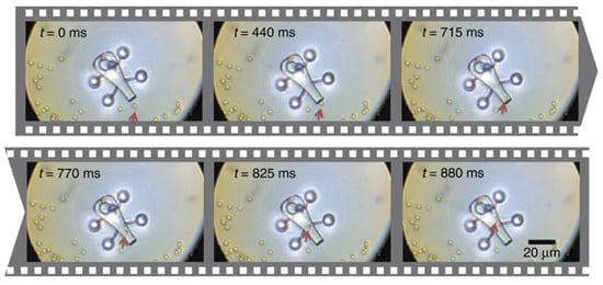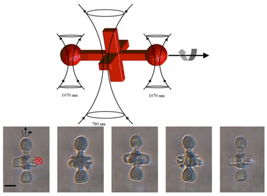 As discussed previously, the force resulting from the interaction of the laser beam with the object of interest is commonly split into two parts, and  >  is commonly accepted to be the condition necessary for stable trapping. However, the scattering force can also be used to actuate microrobots, and can be used for applications involving a rotating part which can be “pushed” by the light, rather than being dragged into place [,]. In-plane rotation of a twin-rotor micropump has been demonstrated, by focusing a Gaussian beam on the sides of flat-lobed “wings” []. Out of plane rotation has also been demonstrated using an optical “paddle wheel”. In this case two micro-spherical features were used as “trapping handles” to hold the object in place, while the central “paddle” was driven by the scattering force of another trap, creating out-of-plane rotation []. A schematic of this microrobot, as well as stills taken from a video of it moving, can be seen in Figure 4.