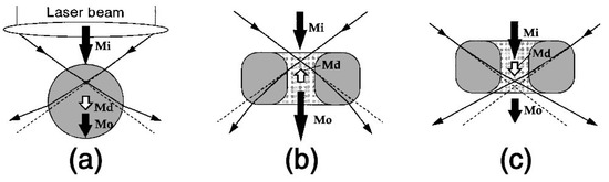 Illustration of the interaction of the optical tweezers with differently shaped low-refractive index particles, and the impact of the position of the beam waist. In (a) and (c) the object shape and the beam waist position act to push the object out of the trap, whereas in (b) the incident forces are balanced on the inner walls of the ring, and the position of the beam waist in the Z direction acts to pull the object towards the waist, producing a stable trap. Mi is the incident momentum, Mo is the outgoing momentum and Md is the momentum transferred from the light to the object. Reproduced with permission from Reference [] ©The Optical Society.
